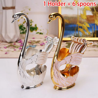 Stainless Steel Silver /Gold Fruit Cake Fork Coffee Tea Spoon Swan Holder Cutlery Set Decor
